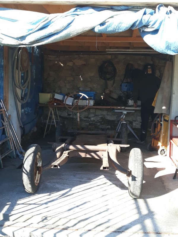 Pour le moment, on emmène le chassis dans le garage derrière la vieille allemande qui me sert de brouette. Et c'est parti pour le premier roulage. Pour arriver dans ledit plus haut. Bon, là, faut que je vous explique ce que sont les travaux gigogne. Pour arriver à ce résultat, il faut d'abord que tu fasses ci pour ensuite réaliser ça, et peut-être modifier cette chose, etc, etc...