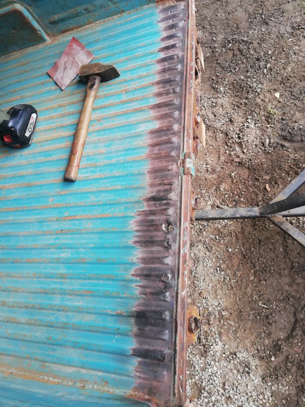 la préparation de la jupe arrière neuve , le caisson entier qui permet de remplacer absolument toute la partie rouillée et bouffée de partout ( ce que vous voyez, maintenu par la pince-étau et le serre-joint, c'est la tôle de fermeture du caisson à souder en dernier, une fois le caisson posé sur la caisse) :
