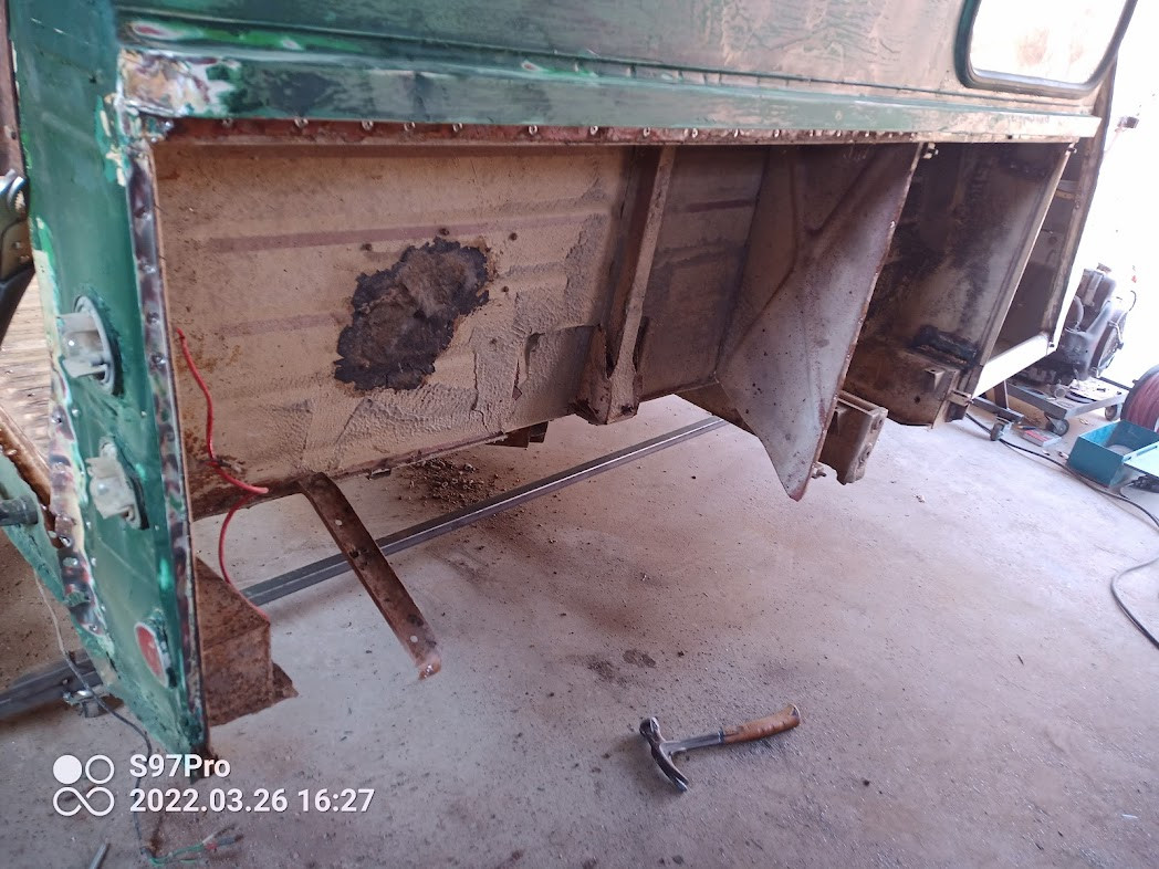 Côté gauche , photo du dessous, j'ai rabattu un peu la lèvre du plancher pour coller le plus près possible la tôle contre le brancard.