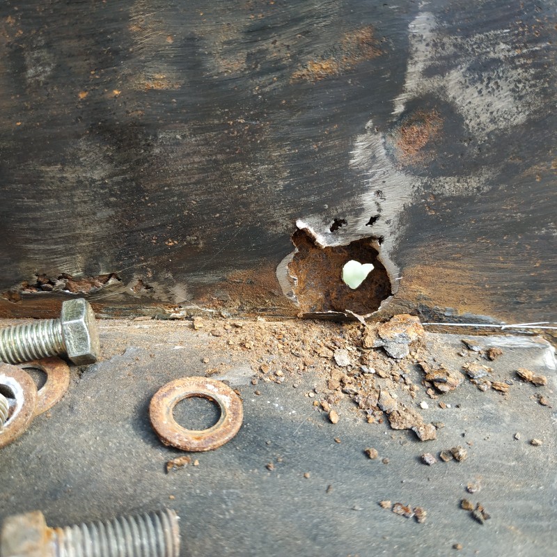 Pour traiter sérieusement l'endroit corrodé que tu présentes, il faut dépointer le support de butée pour pouvoir accéder des 2 côtés, ensuite, découper la tôle au-delà de la zone corrodée, découper un patch dans une tôle saine, y reformer l'embouti et l'adapter à ta découpe (que tu as intérêt à faire la plus" géométrique" possible).