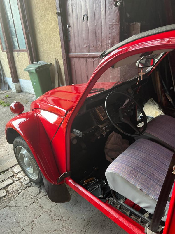 Même sans porte avant, elle est belle ta voiture, j'ai un faible pour les 2cv rouge, c'est pour ça que j'ai acheté une bleue
