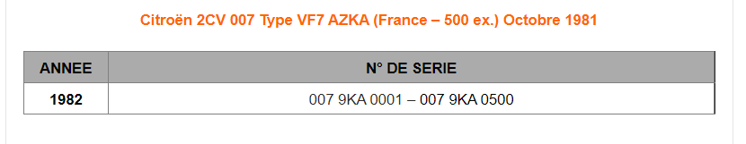 Il n'y a pas de numéro de série spécifique pour les séries spéciales, et tu peux avoir une 2cv6 spéciale (la désignation commerciale de la 2cv6 standard) beige gazelle entre deux 2cv 007.