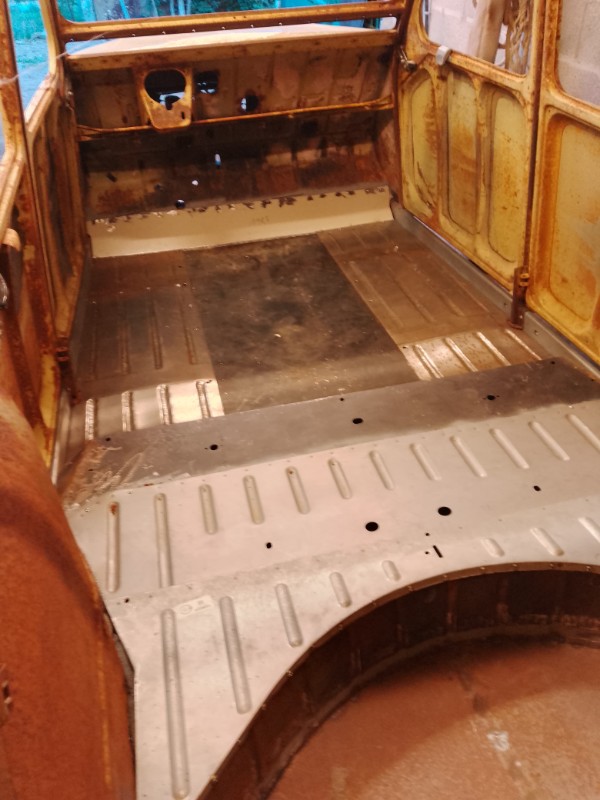 Mais l'assemblage général me donne relative satisfaction. Il y a quelques petites erreurs d'alignement, rien de très grave. Fond de coffre: coût du neuf environ 100 balles chez France 2 cv, moi il me revient à 20 balles de pièce du bon coin-coin + un peu de tôle neuve (sans nervures, ben oui!). Une fois tout soudé, une épaisse couche de goudron masquera avantageusement les imperfections.