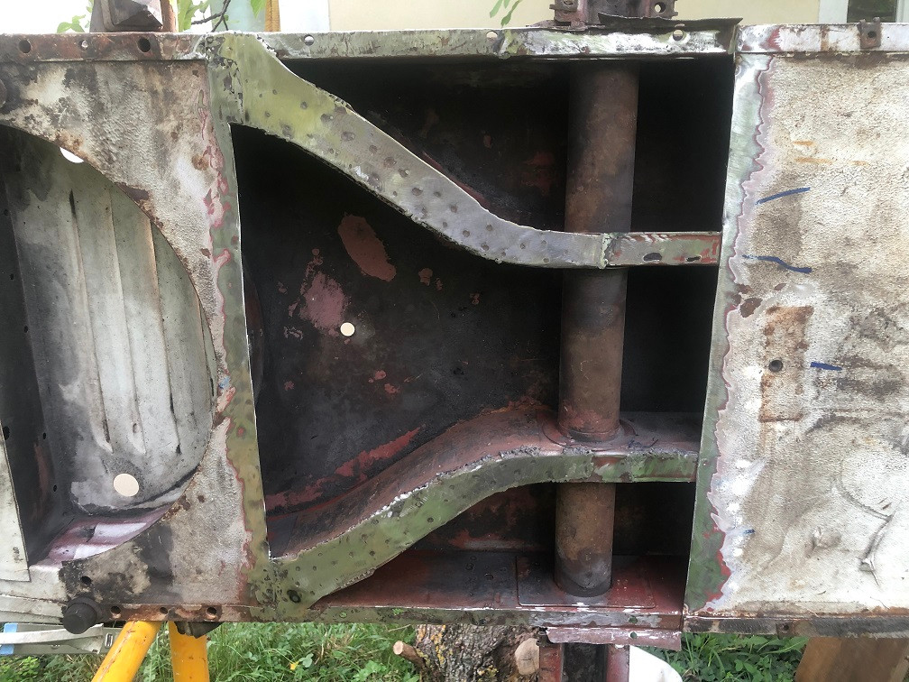 les semaine passent avec les soucis et le bricolage reprend donc voici sous vos yeux ébahis la photo du chassis repare et renforcé a coup de toles soudees par point avant fermeture de la tole superieur au fil fourre et par point !