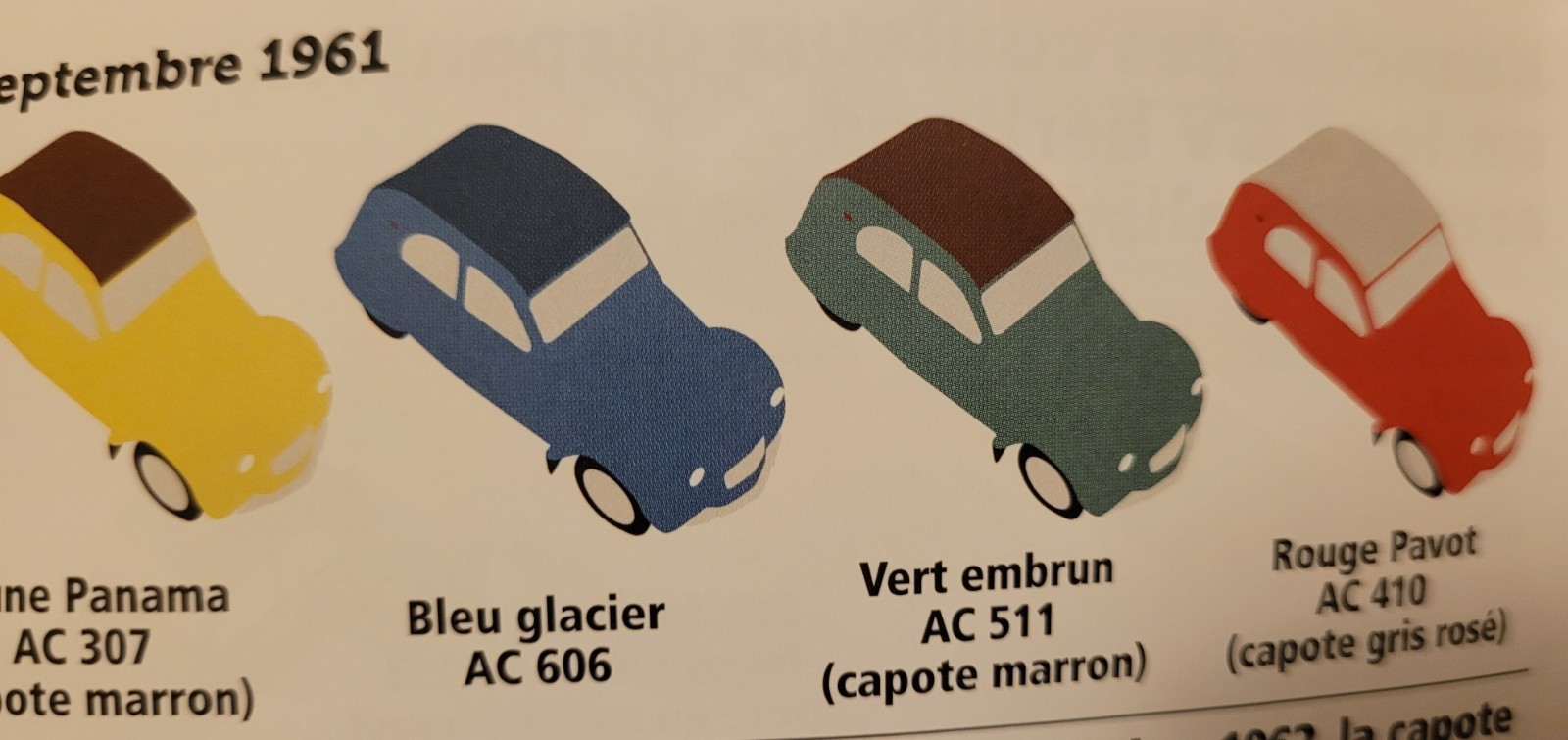 Attention, j'ai fait une petite erreur en écrivant mon message :boulet2: c'est à partir de septembre et non de octobre 1961, du moins c'est ce qui est écrit sur le document, donc marron pour moi mais comme elle est sur le mois de bascule, il y a eu certainement des voitures avec des bâches vertes.