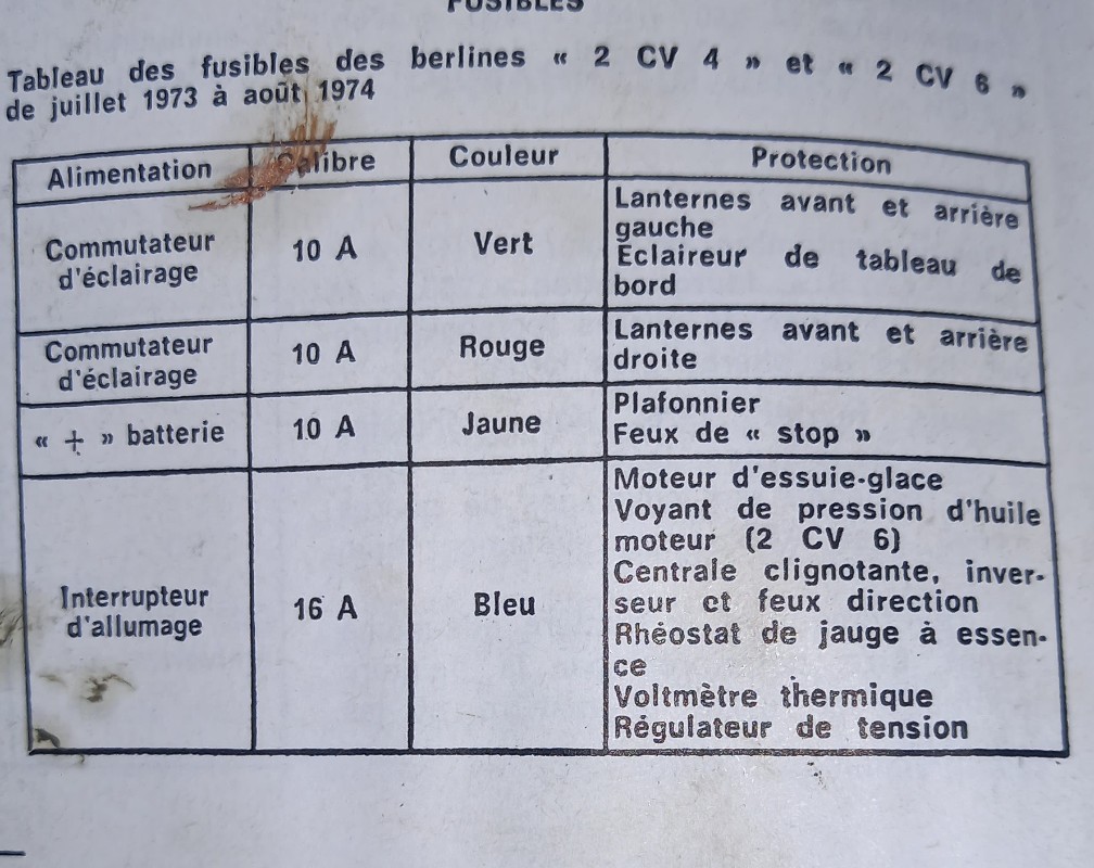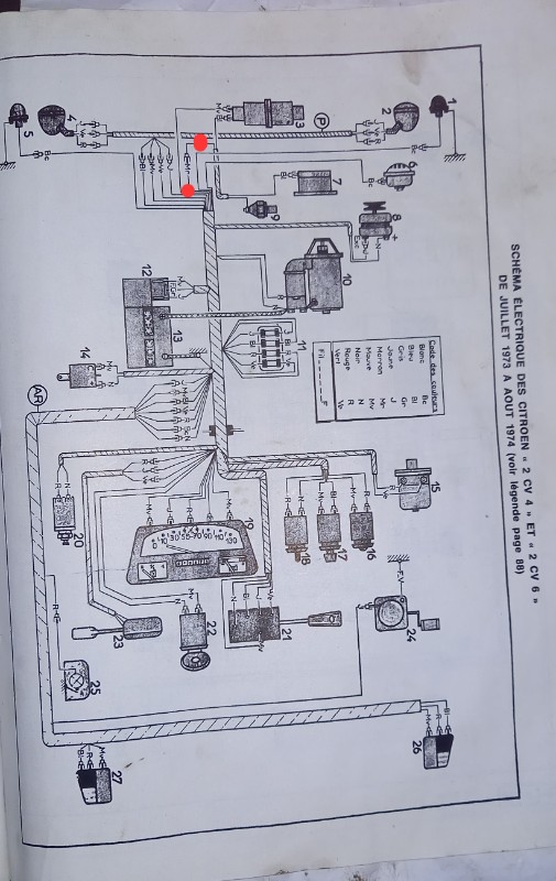 Bonjour @Filofax ,tu a mis un schéma 2CV à partir de 1981,celle de Bill est de 73,le problème peut venir de cosses oxydé donc à vérifier ou fil débrancher