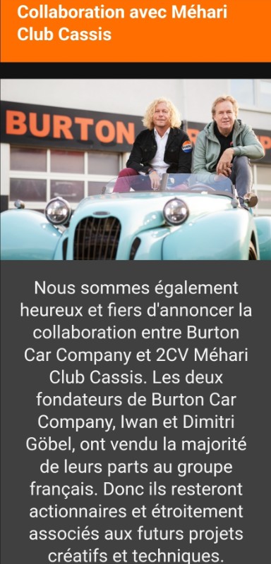 Nous sommes également heureux et fiers d'annoncer la collaboration entre Burton Car Company et 2CV Méhari Club Cassis. Les deux fondateurs de Burton Car Company, Iwan et Dimitri Göbel, ont vendu la majorité de leurs parts au groupe français. Donc ils resteront actionnaires et étroitement associés aux futurs projets créatifs et techniques.