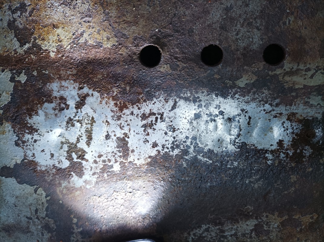 Grâce à ce forum, j’ai maintenant localisé le numéro frappé à froid sur le plate-forme près du siège passager, qui, je pense devrait être le même que le numéro de série sur la plaque du constructeur. Malheureusement, le nombre frappé à froid n’est pas concluant en raison de la difficulté à lire les chiffres, de la rouille et d’un mauvais frappé.
