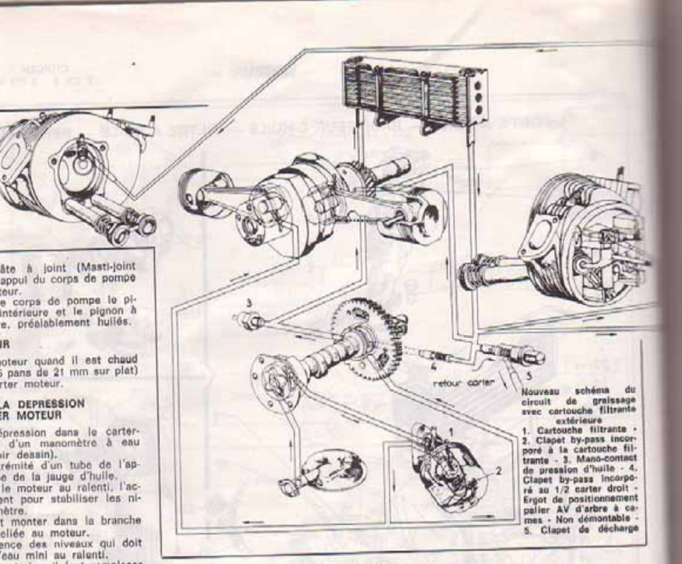 Dans ton circuit de 2cv, tu as des fuites calibrées, voulues par les ingénieurs pour permettre la lubrification des paliers (AAC, vilebrequin, bielles) et de la culbuterie (les vis ont des trous calibrés pour gérer cette "fuite"), ce qui va entraîner une valeur calculée de 6 kg/cm2, à 6000 tours min, à 80° (pour un 602 cm3).