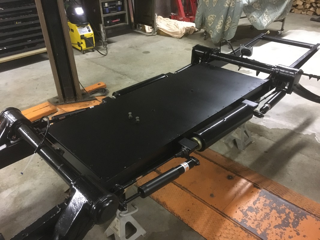 Pose du réservoir et du support de caisse . Je sais c'est pas grand chose mais mise à nu du support et peinture 2 couches hammerite puis au démontage du châssis j'ai du couper les boulons des plaques filetés qui maintiennent le support de caisse sur châssis car indesserrables er par la suite de retarauder les filetages en 10 car je n'avais pas les boulons spécifiques , toutes ces petites choses prennent du temps