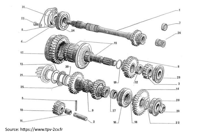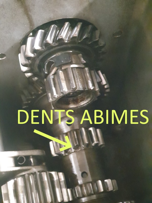 Et les dents abimées sont dûs au passage du baladeur 1-MA qui vient s'engrèner (c'est pour cela qu'il faut éviter de faire "craquer" le passage en 1, en engageant d'abord la 2 puis en repassant la 1, juste après).
