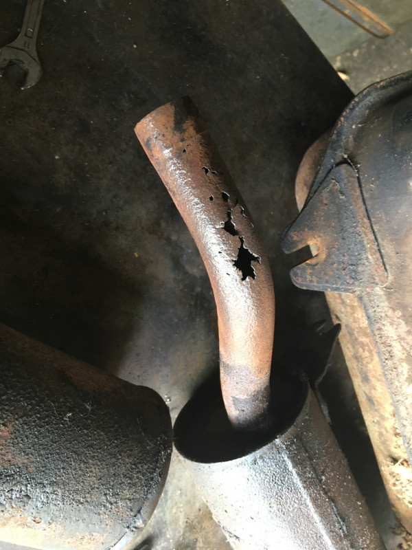 Je suis donc revenu à l'établi, et essayé de souder une tôle de réparation de la sortie du pot de détente. Je précise que le pot est en excellent, à part les trous dus à la corrosion sur le tube de sortie.