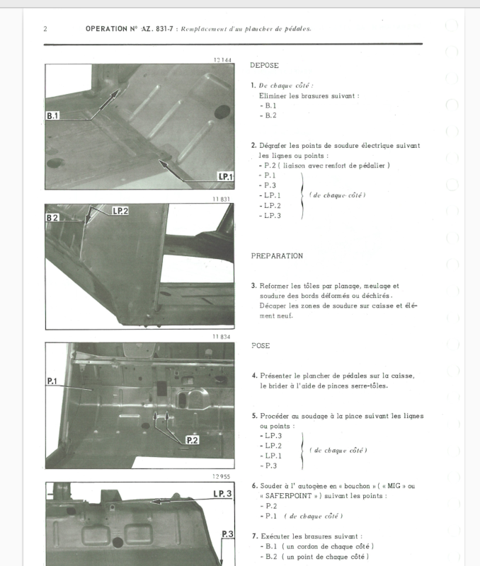Le plancher pédales est pointé sur tout le tour, tu as toute la ligne horizontale au niveau du tablier, la partie au niveau de la tôle d'auvent jusqu'aux bas de caisse mais je crois que tu as déjà fait le boulot, puis au niveau des planchers latéraux, sur la mienne c'était pourri donc ça facilite le travail. Déplier les 2 tôles avant de dépointer.