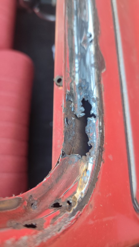 Puis un petit coup de bombe antirouille, du rouge. Faut maintenant mettre un coup de polisseuse et ... remettre en place le pare brise et croiser les doigts pour que ça ne fuit pas (ca ne fuyait pas avant démontage).