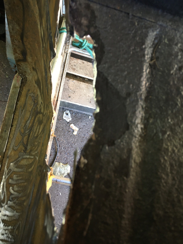 On peut voir la tôle, ici saine, une fois l'enduit bitumeux soulevé..