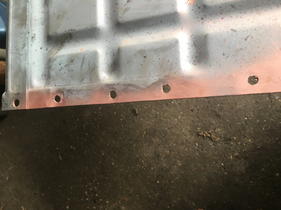 J'ai procédé aux soudures de la tôle d'auvent avec le plancher pédales (pas trop mal réussies, malgré de gros pâtés disgracieux à meuler !) en ayant préalablement placé à l'arrière des tôles à souder, une plaque de cuivre calée avec des bois. Les autres soudures furent moins réussies, à cause du traitement préalable des tôles, ou d'un écartement pas assez réduit entre elles ?