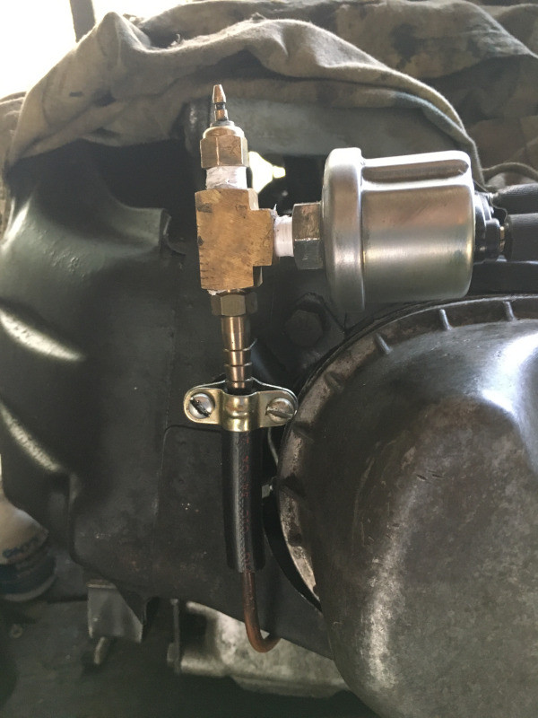 Puis je me suis attaqué à la soudure du pot de détente et du silencieux, malades eux aussi de corrosion perforante. J'ai aussi terminé l'ajout d'une sonde manométrique et d'une sonde thermométrique d'huile, placées au bout d'un tube cuivre, soudé d'un bout à un raccord 3 voies, et de l'autre à un raccord vissé à l'emplacement prévu pour un manocontact. Ce ne fut pas une mince affaire, mais j'espère que l'ensemble sera étanche...
