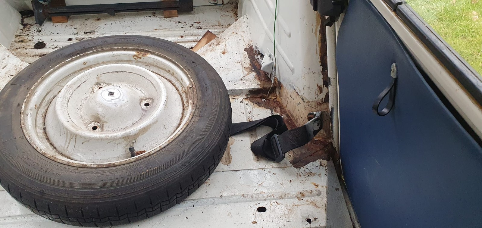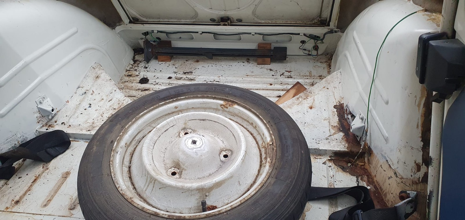 Le plancher de coffre avait été refait 'partiellement' pour eviter un classement épave suite à un léger choc AR... on voit la tôle 'lisse' sous le cric. Du coup, le panneau AR et les queues de pies sont en état (c'est déjà ça) :