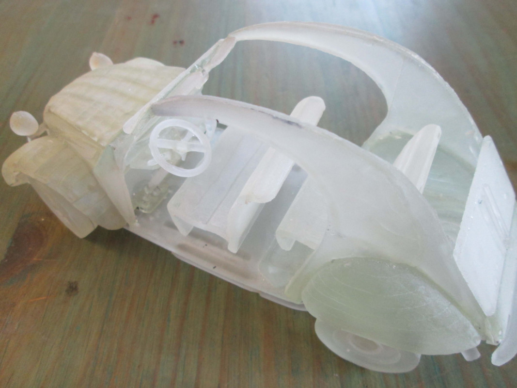 Sablage de l'ensemble, fabrication et pose des sièges, volant, levier de vitesse et pédales, installation des portes