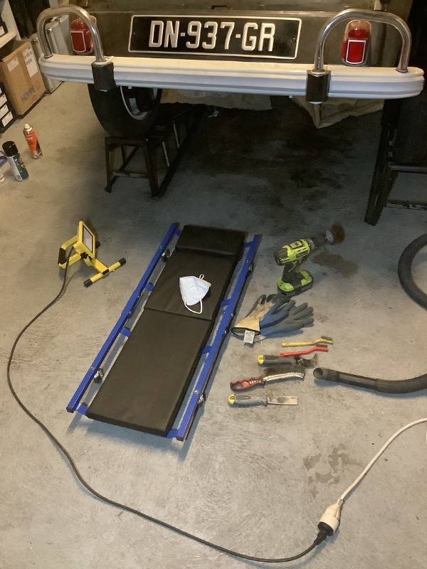 Il faut lever au maxi sur chandelles et sécurisé l'ensemble. Le plus fastidieux étant le décapage des zones rouillées...( Mettre un masque )