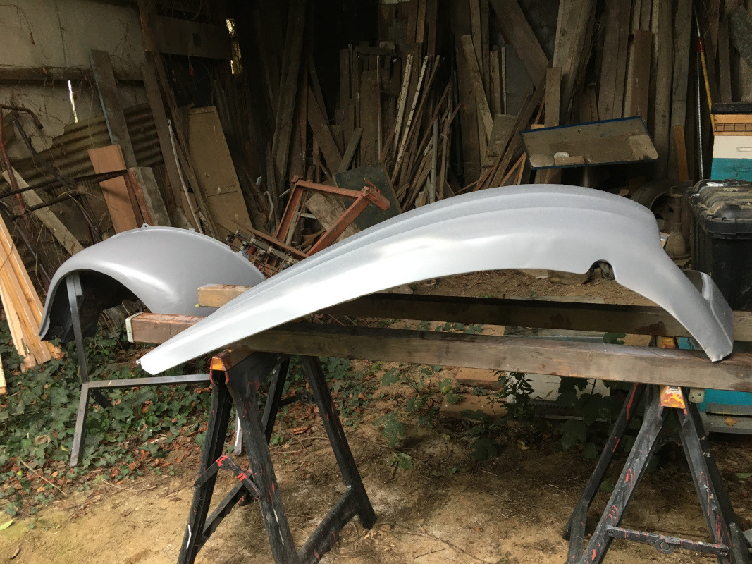 En 20 minutes, tout a été peint. J'ai seulement regretté de ne pas avoir un pot d'apprêt supplémentaire pour faire une deuxième couche "mouillé sur mouillé Mais ce n'est pas si mal : J'ai passé au pinceau l'intérieur des jantes pour finir les restes dans le godet du pistolet : En tout cas, ça me convient : Là, j'ai légèrement éraflé la peinture, pensant qu'elle était sèche, après avoir retourné le couvercle de malle... Désolé : Je rattraperai cet "accroc" avant la peinture définitive, la semaine prochaine.