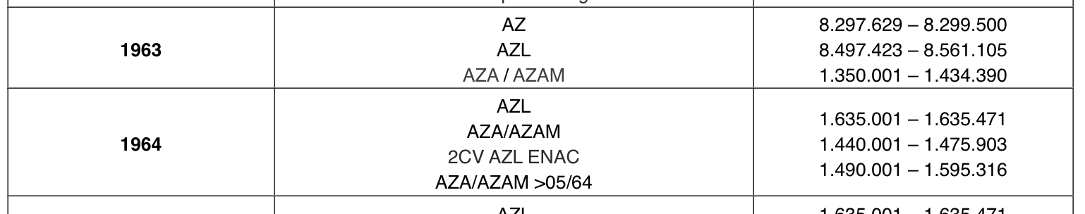 Néanmoins quelque chose me tracasse, quand je regarde le numero de série il est en 1.497 *** ce qui correspond a une AZAM de 1964 d'apres le tableau que j'ai pu lire sur le site sauf que la carte grise indique 1er Immatriculation: 25/10/1963.