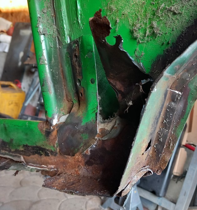 Les bas de caisse sont finalement à remplacer tout comme le caisson arrière, au moment du brossage des soubassements j'ai passé un coup sur la face arrière que je savais HS (elle commençait à gonfler), je vous laisse apprécier le résultat !