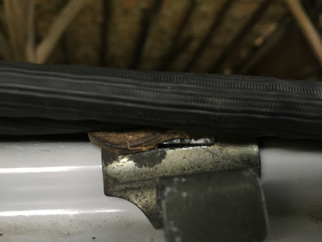 J'ai quand même un problème d'alignement des attaches latérales de la capote. J'ai avancé le cadre métallique d'ouverture au maximum, mais il manque cinq millimètres environ pour les attaches entrent dans les pattes latérales. Et la fixation inférieure de la capote, côté coffre, est elle aussi à son réglage maximum.