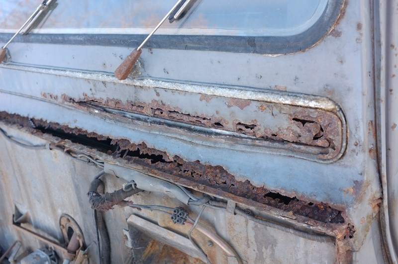 En dentelle car la 2CV est restée stockée 48 ans capot ouvert, la condensation a coulé à cet endroit et voilà le résultat ! C'est plus rouillé à gauche car il y avait un ressort de suspension cassé de ce côté. Heureusement, le tablier n'avait rien. J'ai greffé un morceau de l'ancienne caisse de ma 2CV6 qui n'avait pas du tout de corrosion à cet endroit.