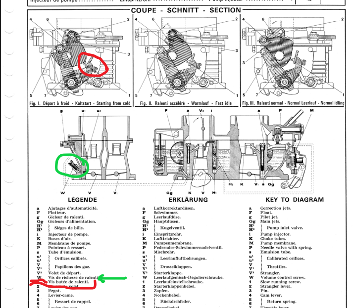 On voit bien sur le plan que ce carbu possède une vis de butée du ralenti (réf 1 souligné en rouge ) et une vis de richesse (réf W souligné en vert).