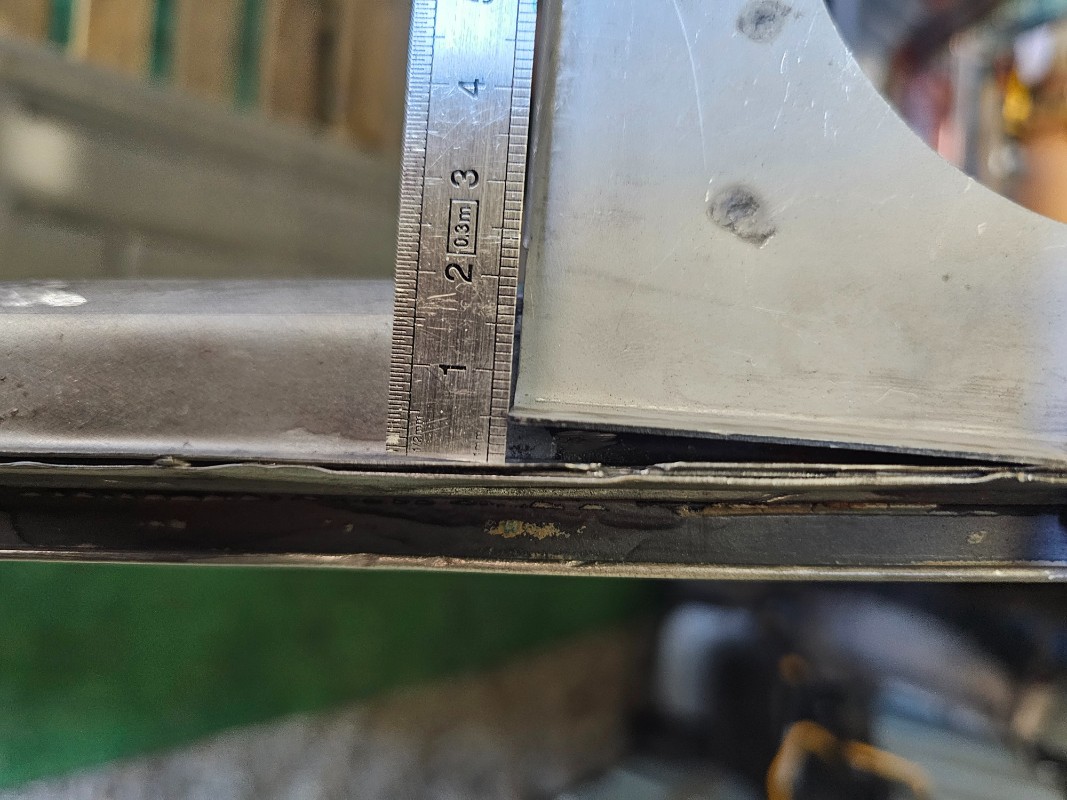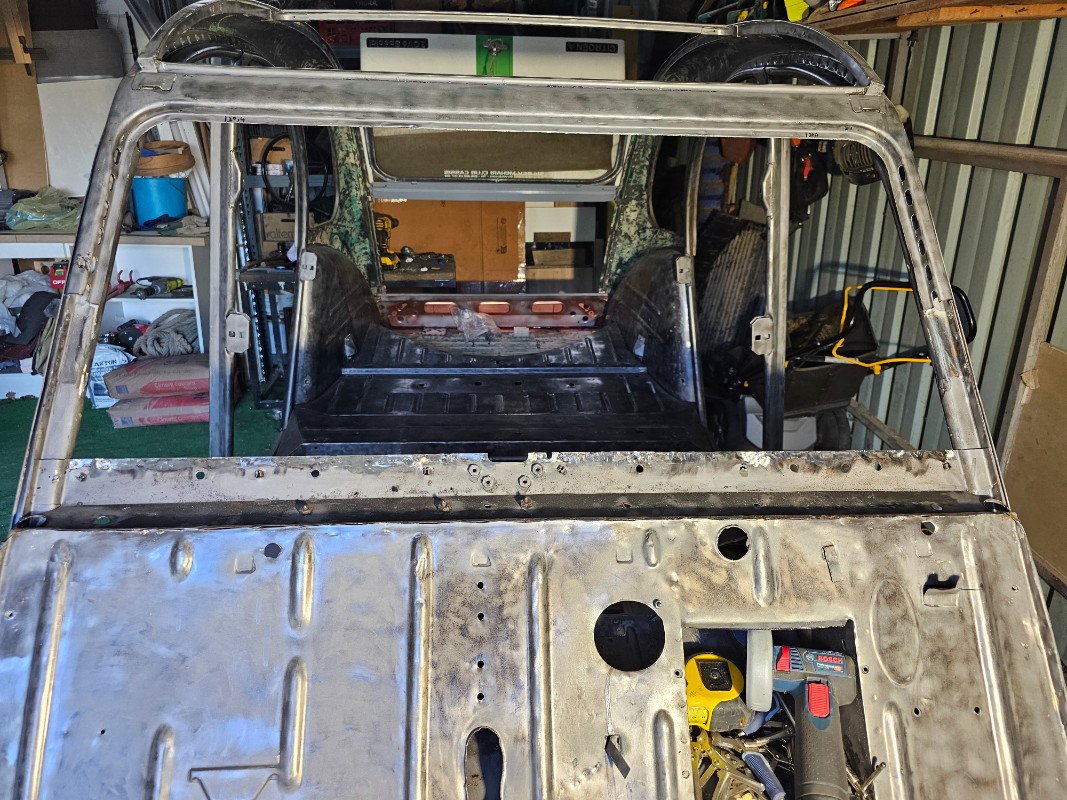 Prochaine étape, mise en place de la caisse sur le châssis, vérification que les trous de fixation sont ok, pointages et après soudure des 2 planchers lateraux