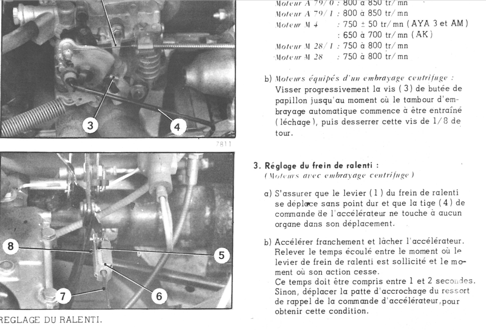 Le ralenti ne se règle pas "au régime", mais au commencement de léchage du tambour de l'embrayage centrifuge (avec réglage de la commande d'accélérateur) : Les bougies préconisées à l'époque pour tous les moteurs sont "AC 43F", "Marchal 35 ou 34 S". Mon père montait des EYQUEM 755 qu'il disait meilleures que les autres, les CHAMPION, par exemple.