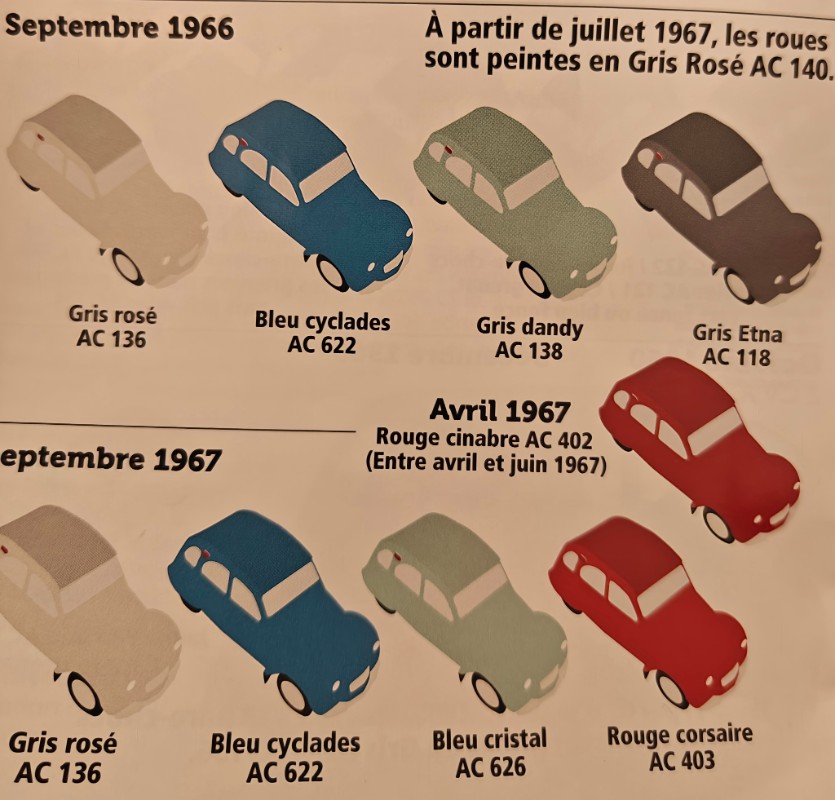 Par exemple, sur mon AZA de 1964, en gris rosé ( AC 136 ) , je crois avoir lu qu'il y avait plusieurs couleurs de capotes avec le rouge des bayadères, par exemple ( à  vérifier ) , le gris, la couleur rouille......... Existe-t'il un "référentiel" qui précise ces couleurs ?