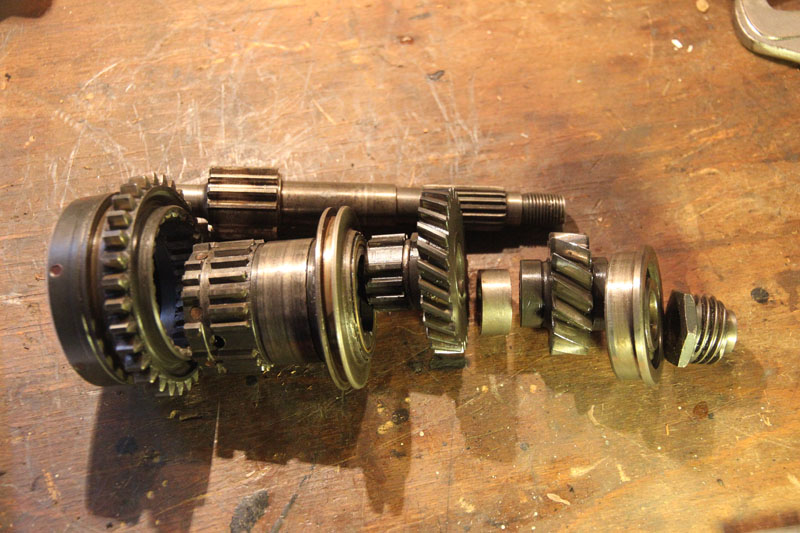 j'ai désacouplé la cloche embrayage, démonté le couple conique, le couvercle dessus de boite, les fourchette et leur tiges respectives et enfin l'arbre primaire (enfin le premier qui se présente quoi). donc dévissé l'écrou, sorti le roulement, et l'arbre avec les pignons dessus.