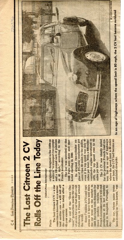Il s'agit d'un article de presse du journal "San Francisco Chronilcle" daté du 27 juillet 1990, et qui relate la fin de la production de la 2CV.