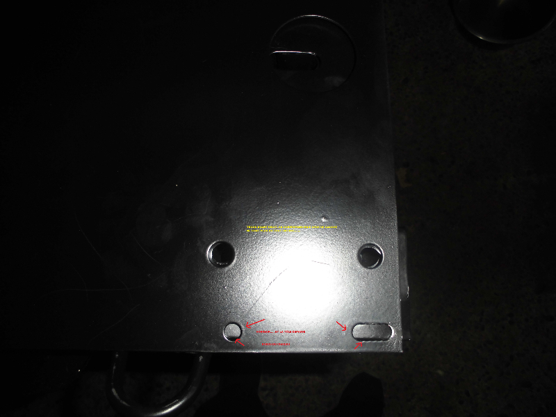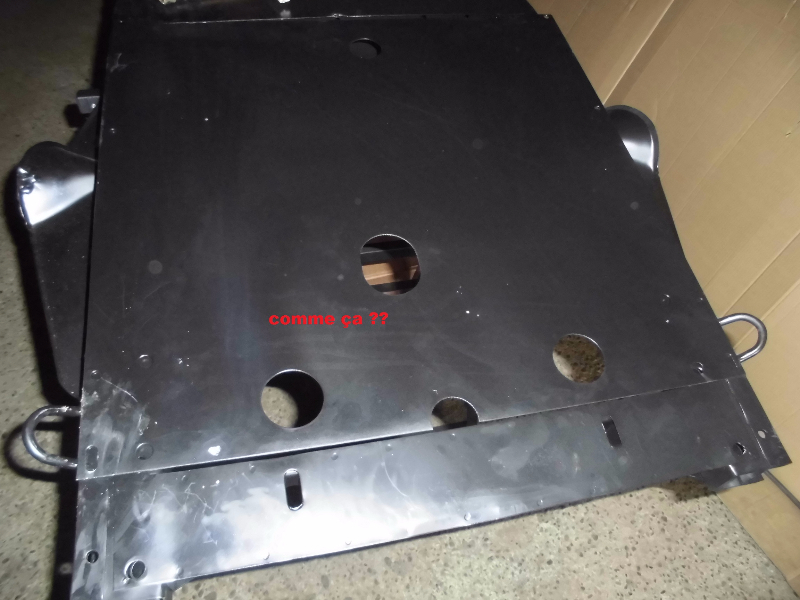 Alors je viens de vérifier la position de ma plaque par rapport au châssis : le gros trou central est légèrement déporté sur le côté droit du châssis pour coïncider avec le bouchon de vidange, les deux gros trous avant eux sont pour les tête de vis de maintien des silent-blocs ; en suite pour la mienne il y a 4 trous de chaque côté pour des vis qui passe au travers du bord tombé inférieur du châssis et viennent se prendre dans des écrous cage pincés sur ce bord tombé (ourlet), reporte toi aux côtes sur mon dessin.