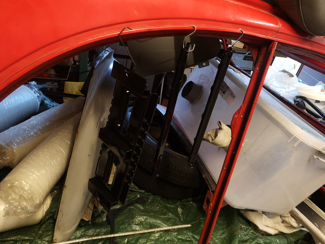J'ai démonté les sièges qui étaient bien foutus aussi: Décapés... Et repeints Certaines zones sont cassées au niveau du dossier du siège conducteur, je devrai les ressouder avant de mettre la 2e couche d'Hammerite.