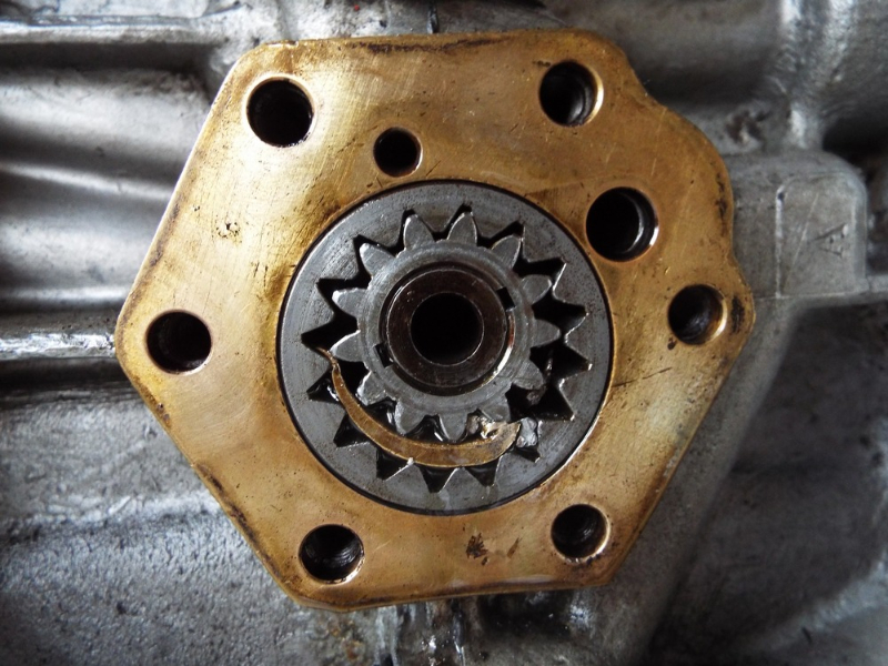 Ta pompe doit être bloquée car elle semble en contrainte à cause des morceaux de fer entre dentelures et cannelures ( :D ) sur la photo on dirait que l'espace entre l'engrenage et le corps est moindre à 4h qu'à 10h ... peut être tu pourrais essayer d'extraire ces intrus pour libérer cette contrainte ?