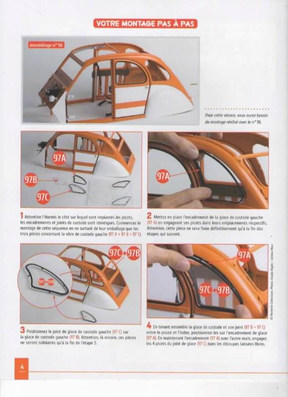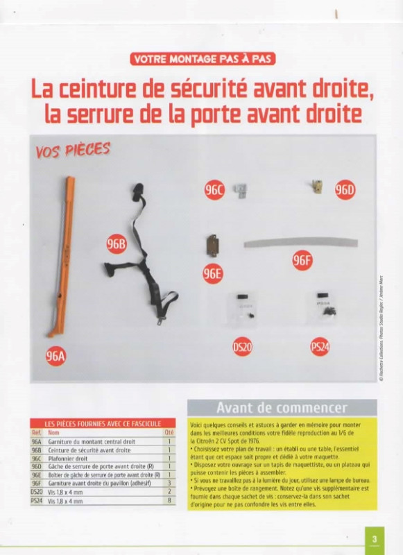Voici la suite du montage de Spoty, grande sœur de Dolly. Fascicule n° 96 La ceinture de sécurité AV droite et la serrure de la porte AV droite