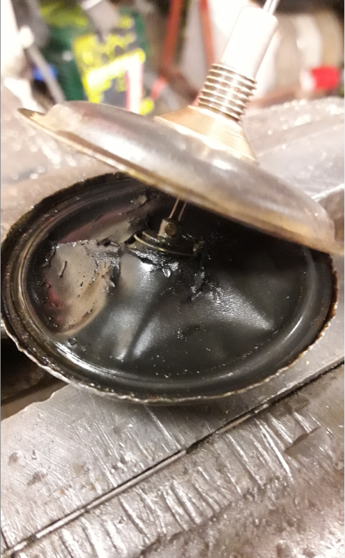 On dégoupille l'axe et on perce à 2,5 m/m et ébarbage du matage ensuite opération taraudage à 3 m/m ( c'est du laiton ) et découpe à la bonne longueur d'une vis en inox de 3 m/m , j'ai fait le montage avec de la Loctite 243 .... il y en a d'autres ! , mise en place de la nouvelle membrane ( membrane en provenance d'un kit de réparation de pompe à essence de Traction , les membrane sont triple épaisseurs je n'en ai gardé qu'une qui correspondait en épaisseur ).