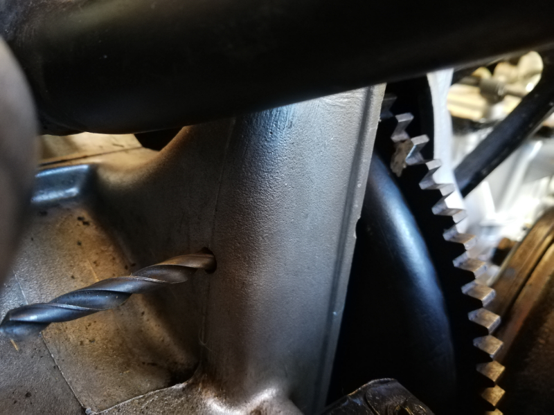 1: repérage de la dent en position allumage, pige en place , je l'ai barbouillée de blanco sous le boulon de maintien moteur/boite car depuis l'avant, à travers le carter moteur, j'ai un alignement précis carter/dent :