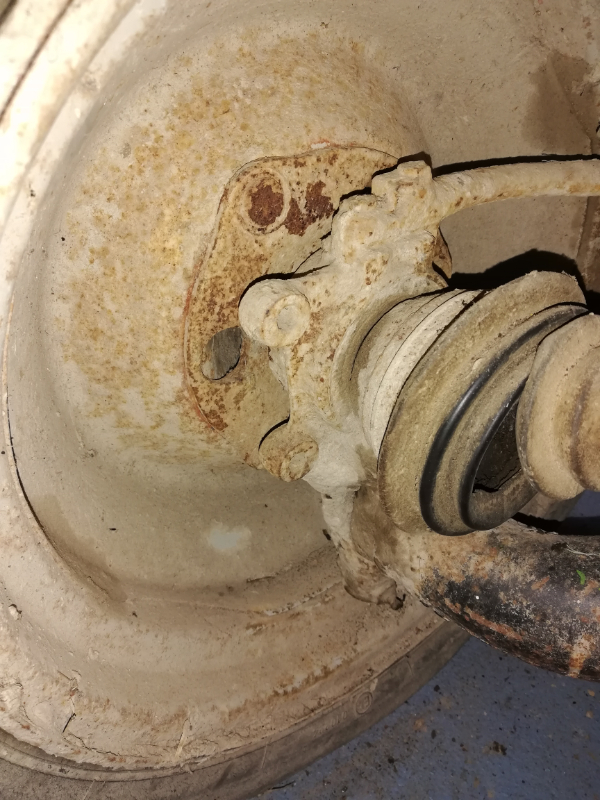 de la roue gauche avec le batteur et la roue droite sans batteur mais avec les trous de fixations : A mon avis, l'ancien propriétaire a dû perdre ce batteur et ne s'en est même pas rendu compte car on voit bien que la boue est aussi sur les trous de fixation et il ne m'en a pas parlé du tout...