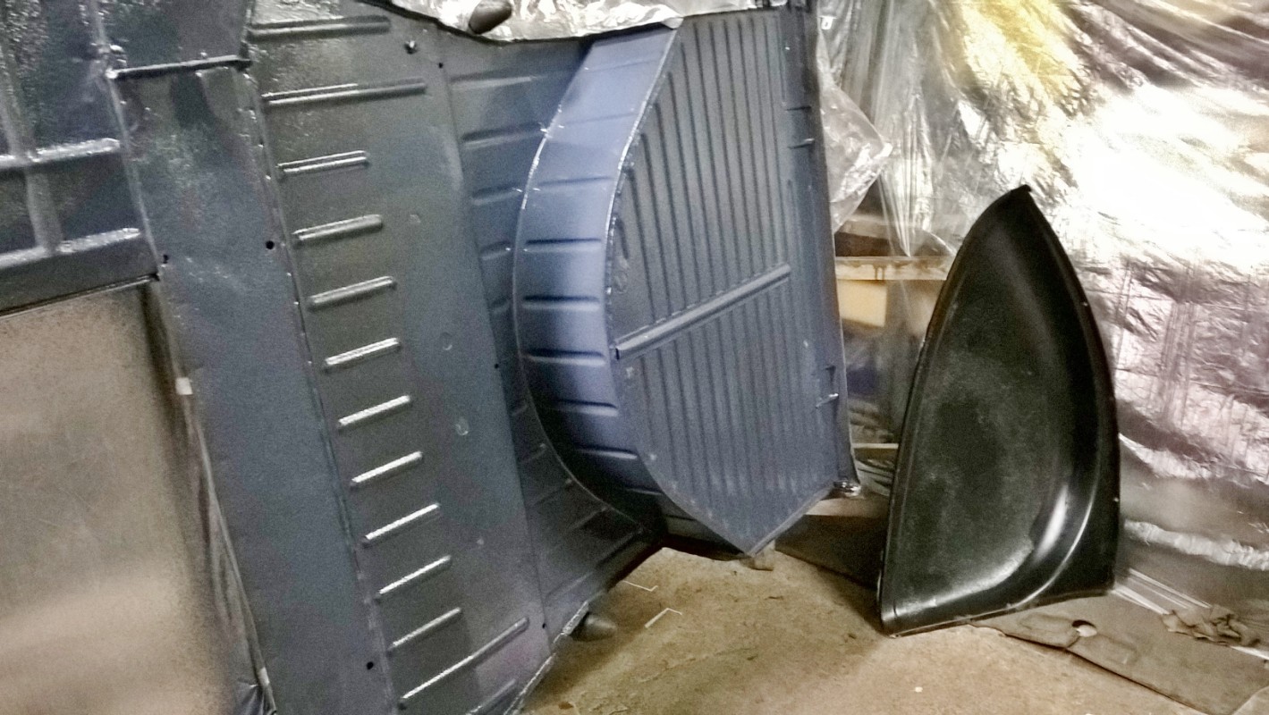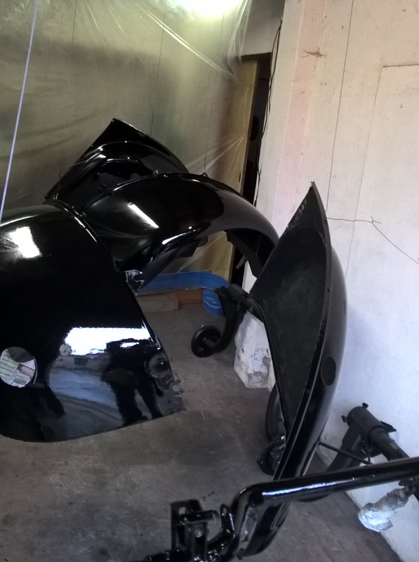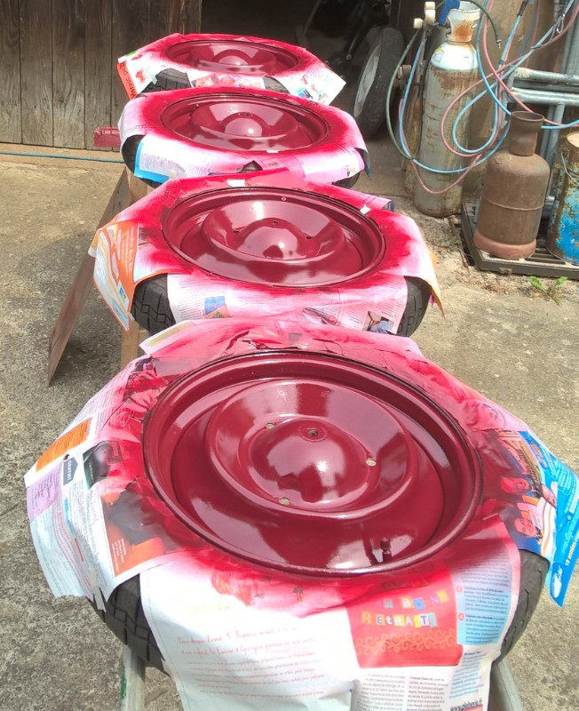 En même temps que le travaille sur la rouille de la caisse dans le garage, j'ai profité du beau temps et des température plus douces pour finir la seconde couche de peinture du châssis et des petites pièces en extérieur.