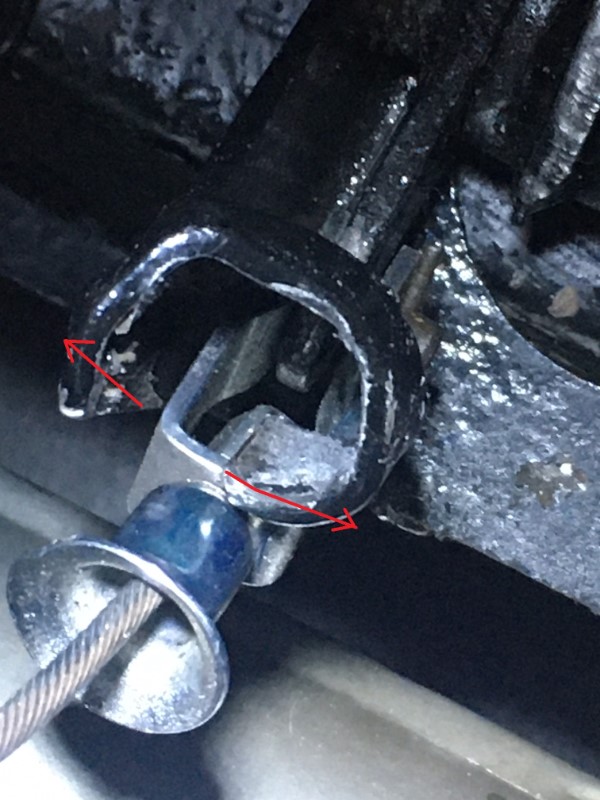 Ce midi, impossible de débrayer, panne improbable trouvée, la butée du câble d'embrayage sur le support de pédalier ouverte