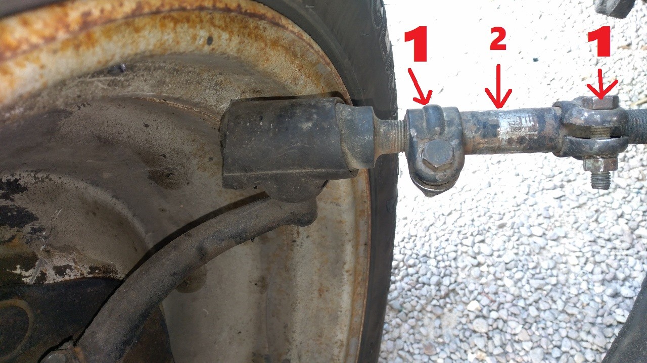 j'ai donc procéder à un réglage de la barre de direction, j'ai dévisser les 2 vis( " N°1 " en rouge sur la photo), puis j'ai pris une pince multiprise et tourné le petit manchon (N°2 en rouge sur la photo )qui relie le système, afin de tenter de refermer un peu la roue ( d'ailleurs j'ai du tourner un peu dans les deux sens, et sans doute plus dans un sens que dans l'autre, sens sens anti horaire )...
