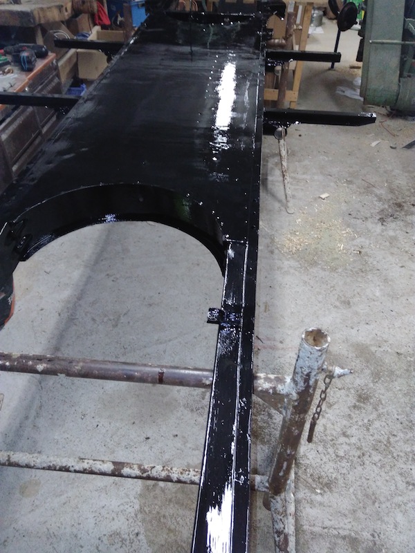 ensuite côté châssis, passage de l'antirouille au pinceau sur tous les éléments (châssis, essieux, batteurs,...) puis après séchage, passage d'une couche de noir + antirouille uniquement sur le châssis. Prochaine étape: couche finale noire antirouille sur le châssis et tous les éléments (essieux,...), puis antigravillon sur tôle inférieure châssis: