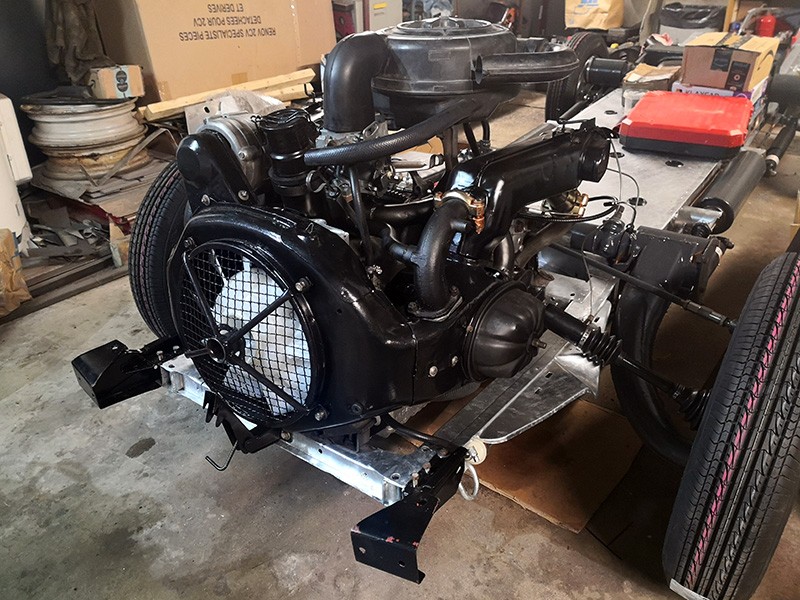 Ensuite, j'ai remis le moteur, agrès avoir bien entendu changé la butée d'embrayage et graissé légèrement le bout de l'arbre primaire qui rentre dans le vilebrequin. J'ai également remis les boites de chauffage et le pot sous boite de vitesses en utilisant des colliers façon Burton. J'ai créé, à l'aide d'une tôle d'aluminium de 2 mm qui j'ai dans mon fourbis, un déflecteur pour éviter que le câble de frein à main gauche ne touche la boite de chauffage. Et j'ai fini ma journée de travail en installant le filtre à essence à sa place (au niveau du châssis, bien avant la pompe à essence, l'alternateur (sans sa courroie, voir plus loin) et la boite à air. Et j'ai mis tout ça dans son carton, en attente de la suite. Je pense que la première question qui va être posé sera :
