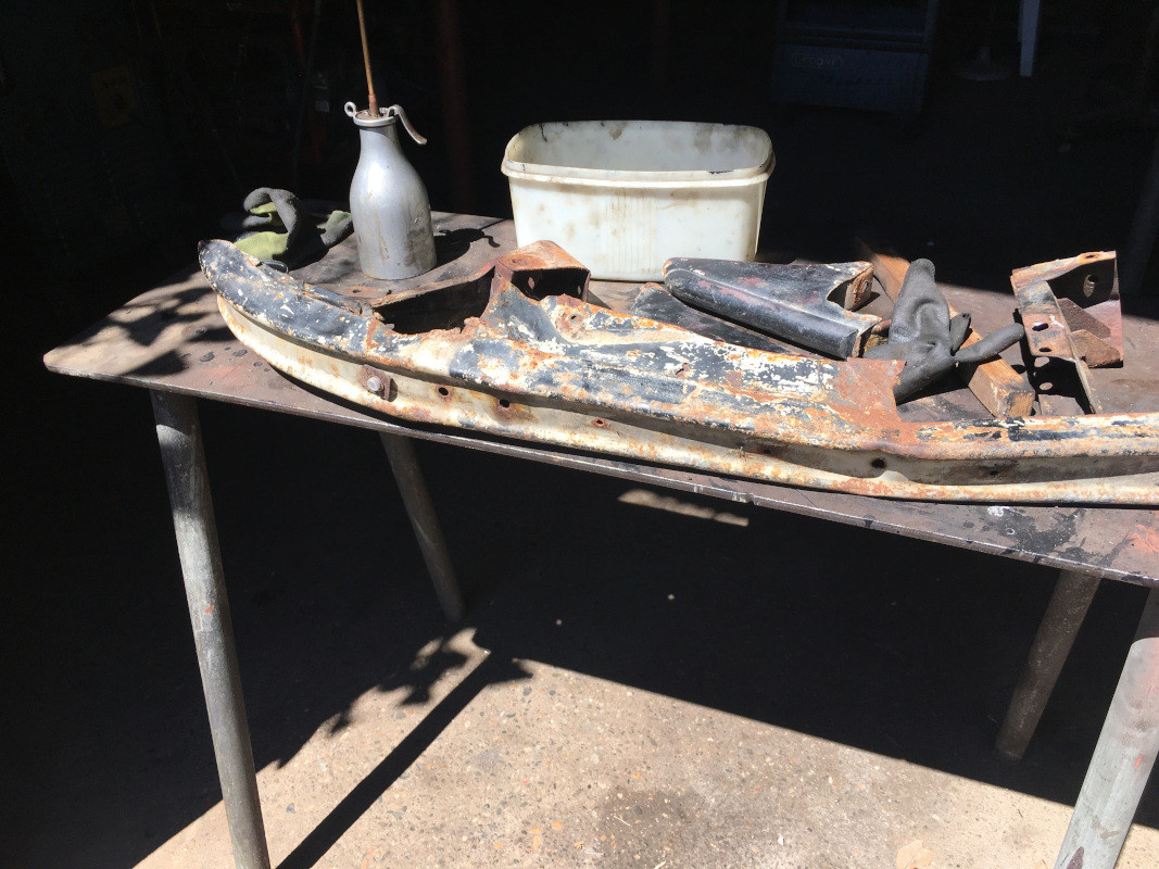 J'ai en effet l'intention, après avoir terminé de poncer la caisse, de préparer les pare-chocs avant et arrière : démontage, nettoyage, protection du métal, masticage, ponçage, puis apprêtage, en même temps que la caisse.