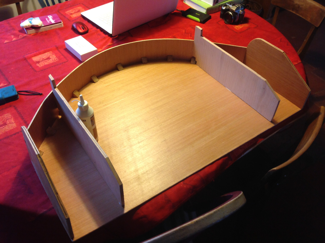 Pour la partie arrondie je me suis fait un gabarit en carton : je pose le carton a plat sur la partie arrondie de la caisse et je tappe doucement sur le carton tout le long de l'arrondi avec un maillet. ça marque le carton et il n'y a plus qu'a decouper...