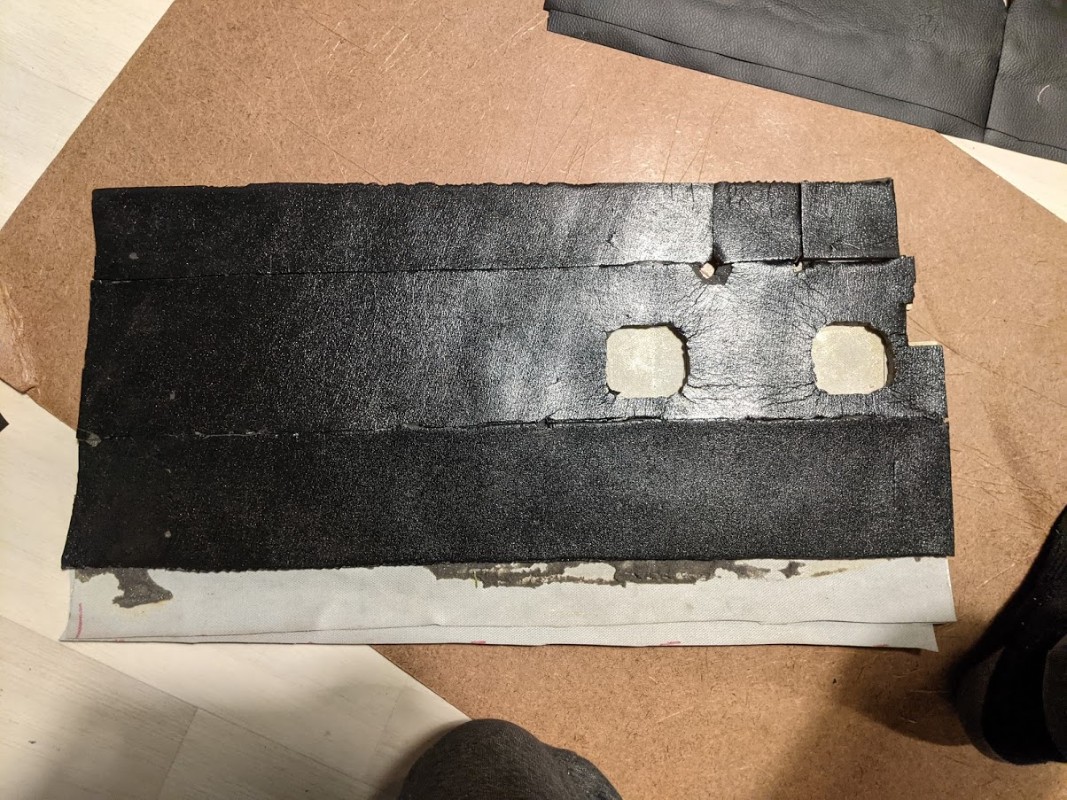 On a choisis des plaques insonorisantes en mousse (citées dans le lien précédent), étanches d'un côté (côté tablier), et mousse "à nu" de l'autre sur lesquelles je suis venu coller du simili noir à la néoprène. Le tout sera monter sur velcro pour pouvoir décoller les garnitures après une grosse exposition à l'humidité histoire de faire respirer tout ça, ou tout simplement si il y a des entrées d'eau !